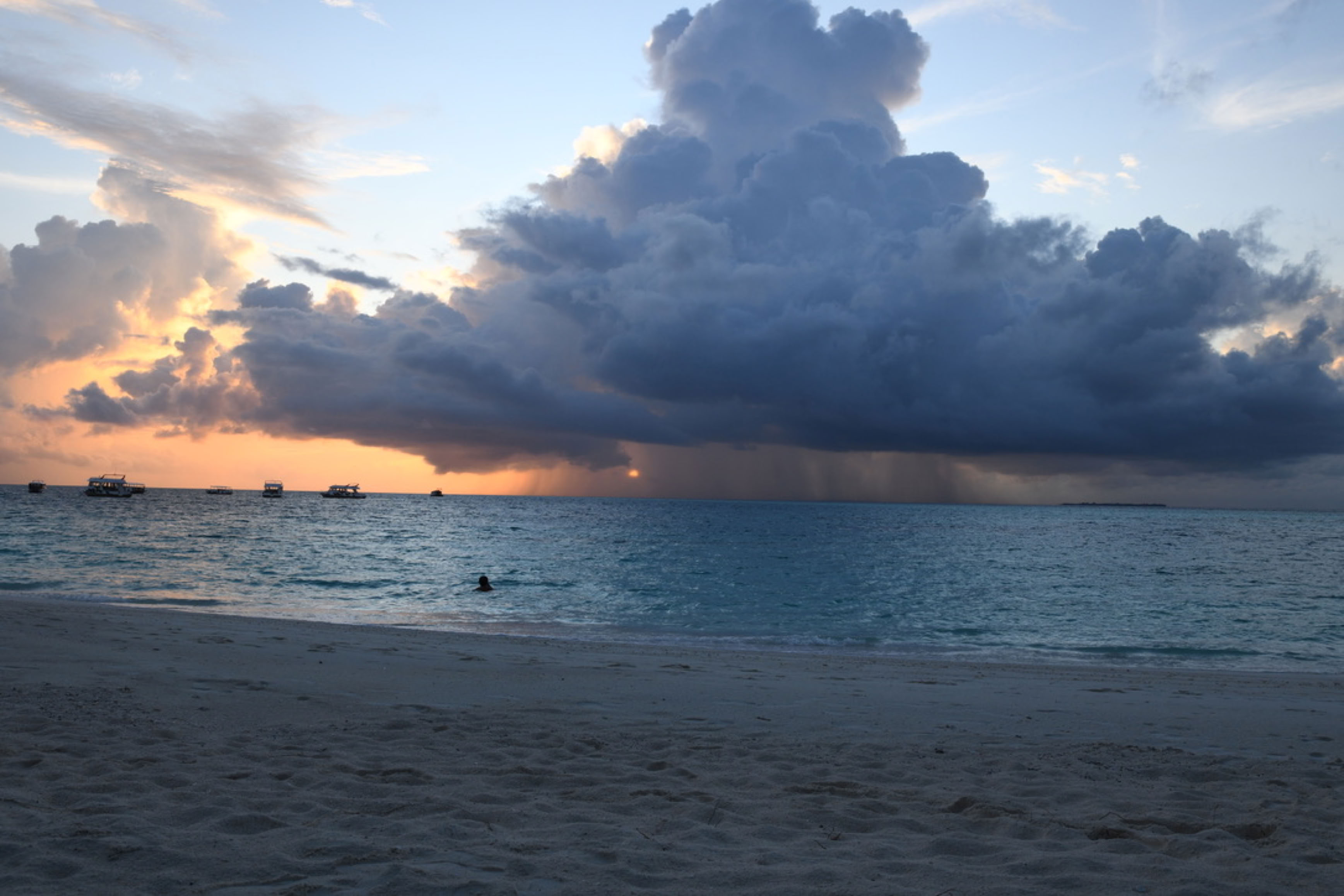 Der Sonnenuntergang fällt so ziemlich aus, da sich genau dort eine dicke, fette Wetterwolke mit Regenschauer aufhält.