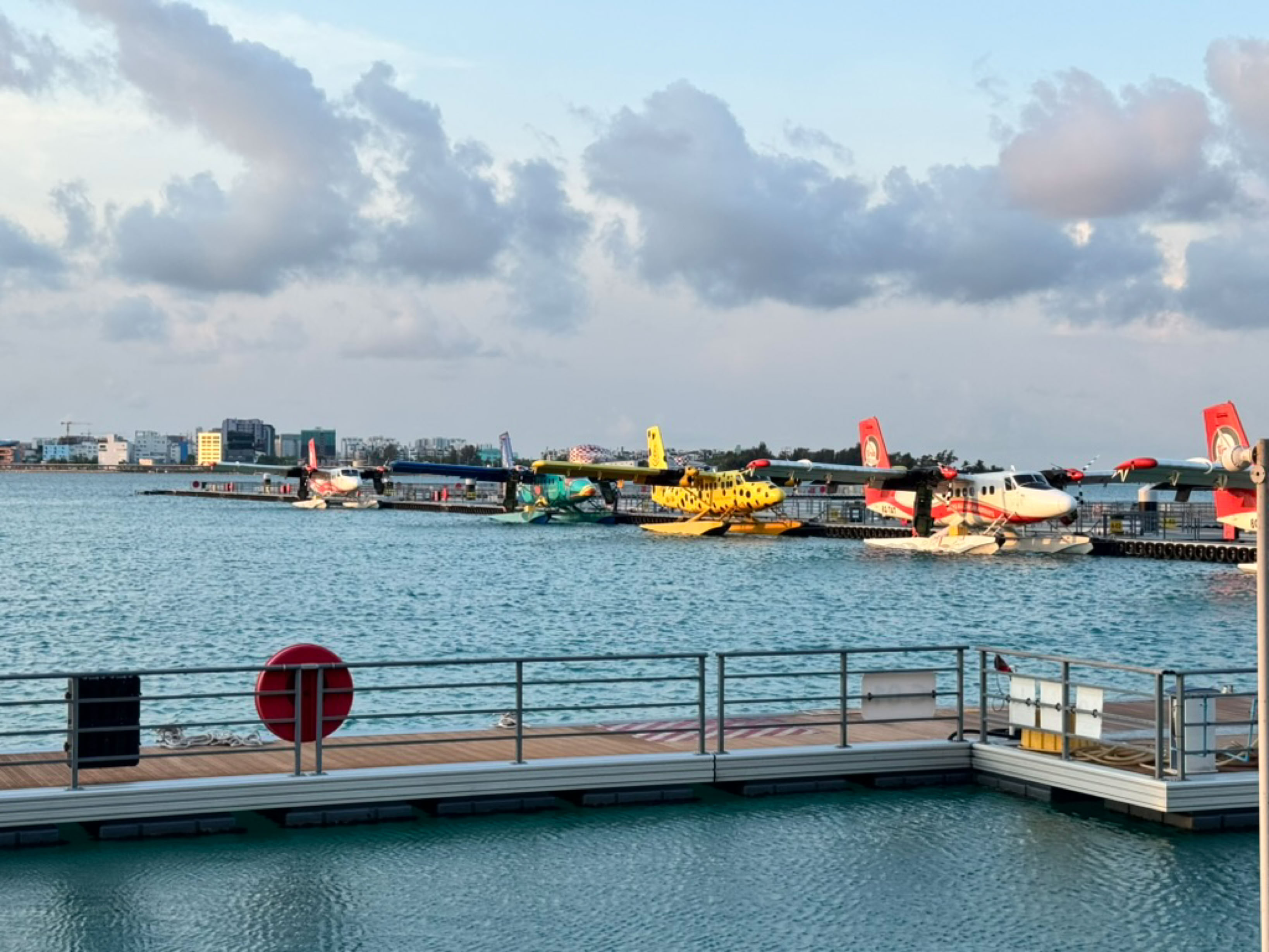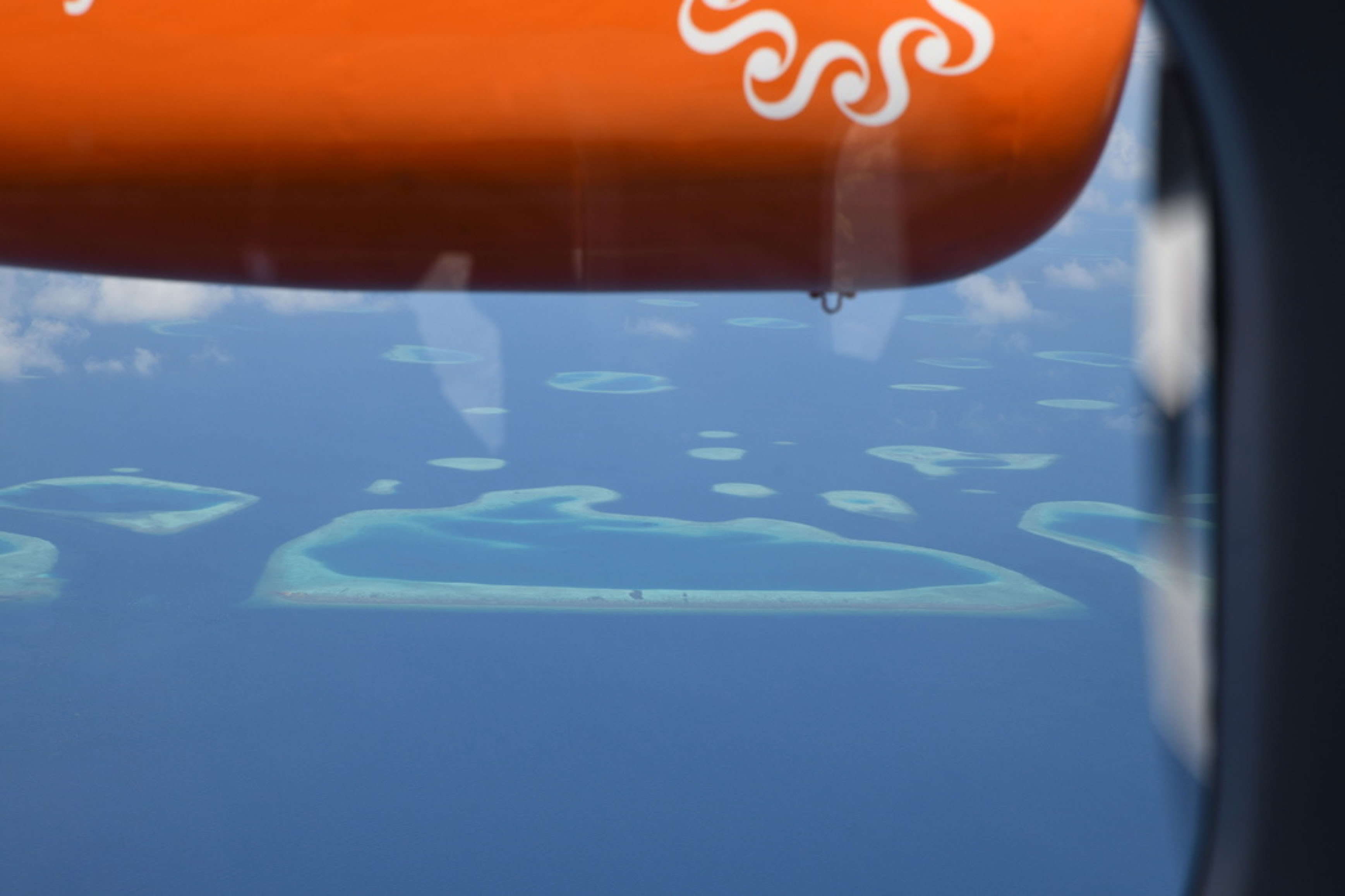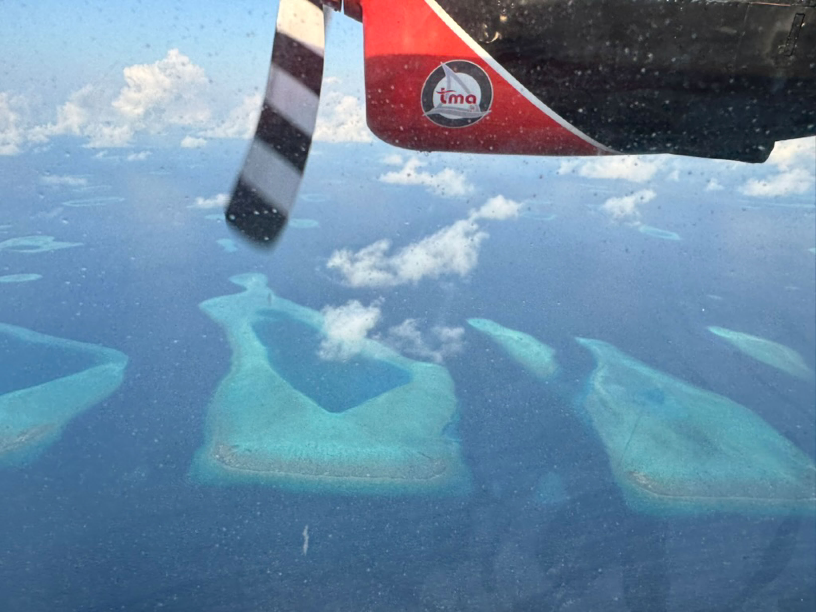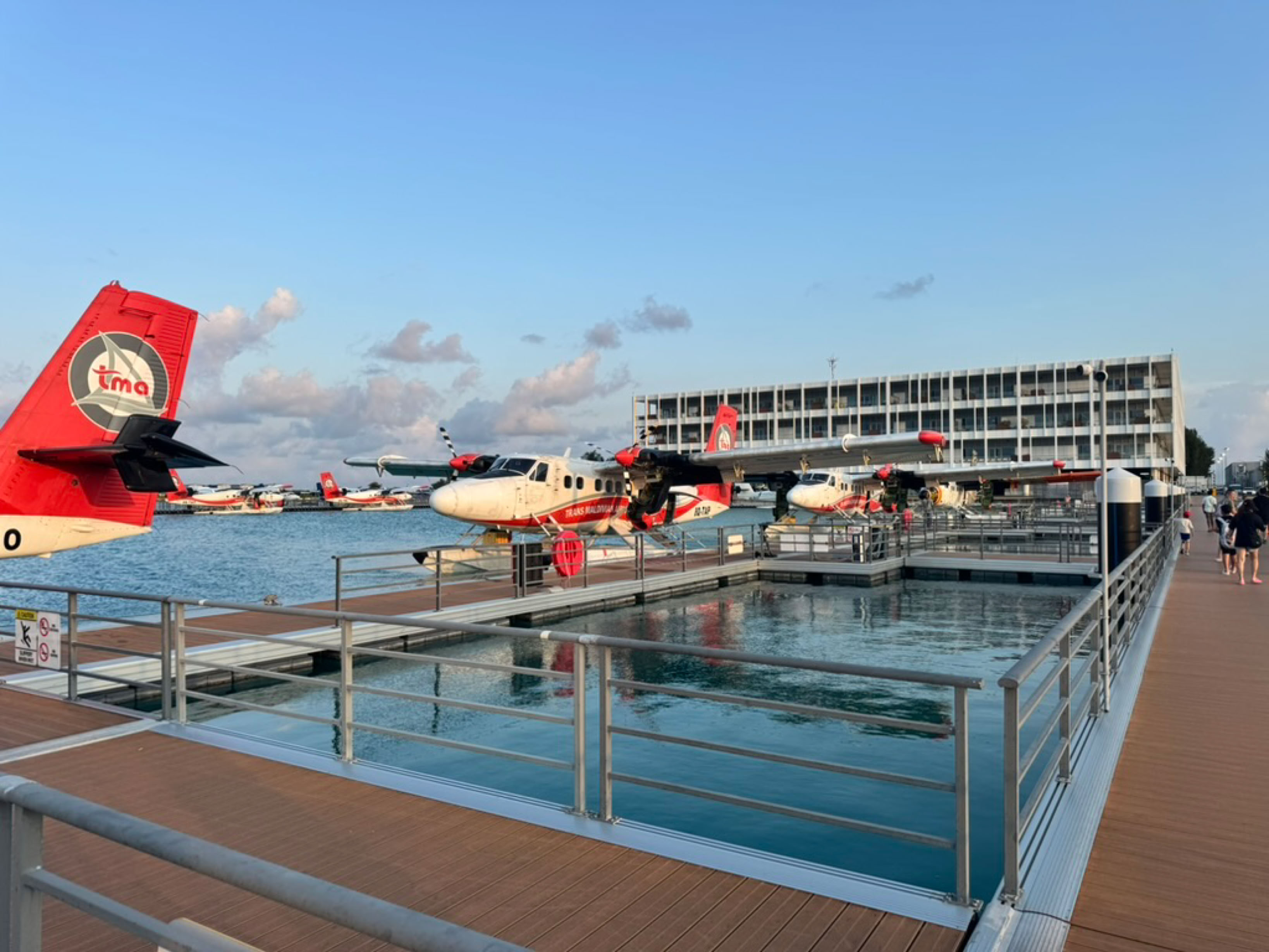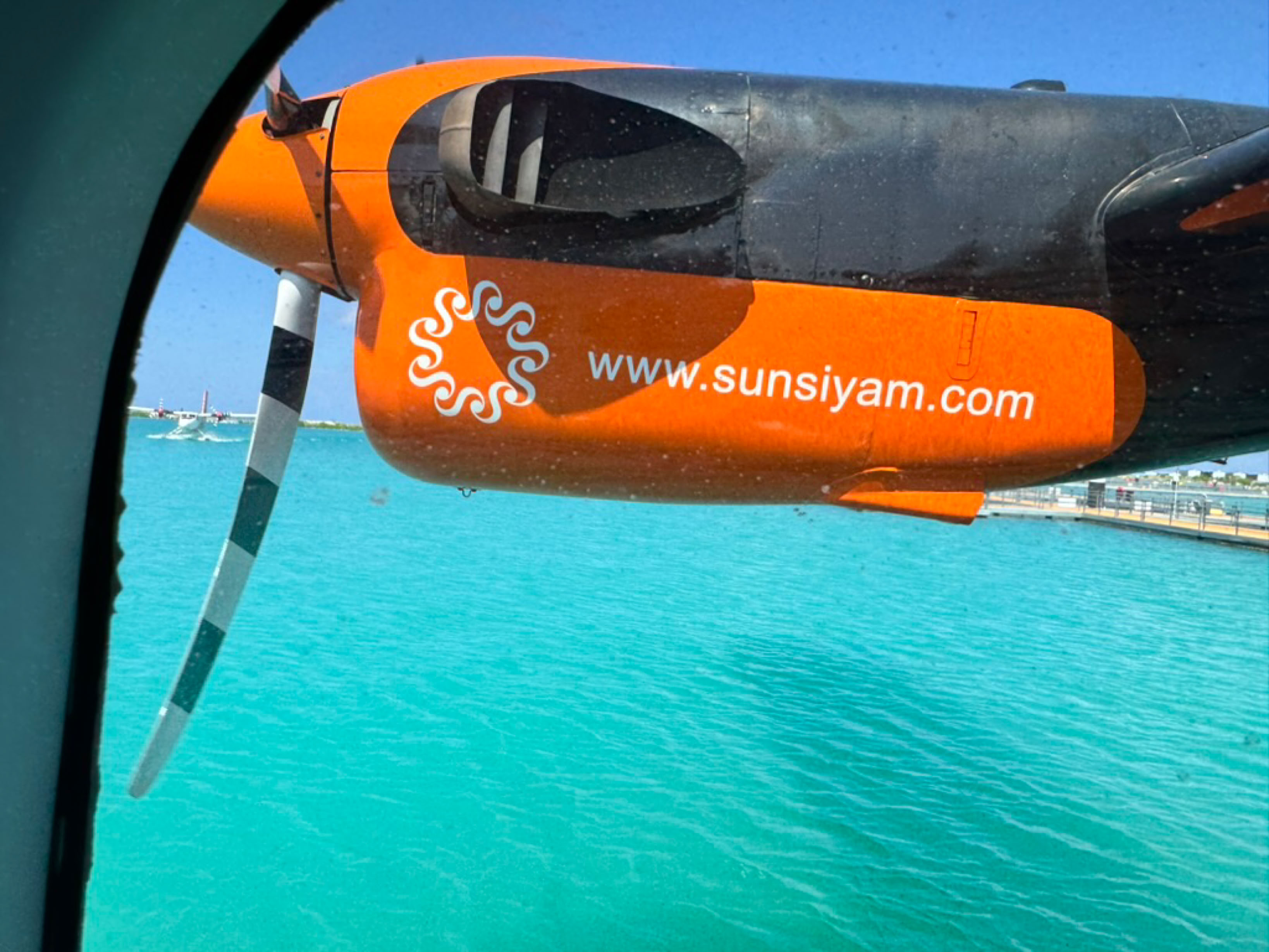 Am Abreisetag (Montag, 5.5.) können wir noch nach dem Check-out (12:00 Uhr) bis Nachmittag in unserer Villa bleiben. Martin kommt dann rüber. Wir bleiben noch bis Nachmittag und dann gegen 15 Uhr gehen wir vor zur Rezeption. Bezahlen, Verabschieden und dann geht es auch mit leichter Verspätung los. Erst mit dem Boot ca. 10 Minuten zur Nachbarinsel. Dort steigen wir dann auf das Wasserflugzeug um.