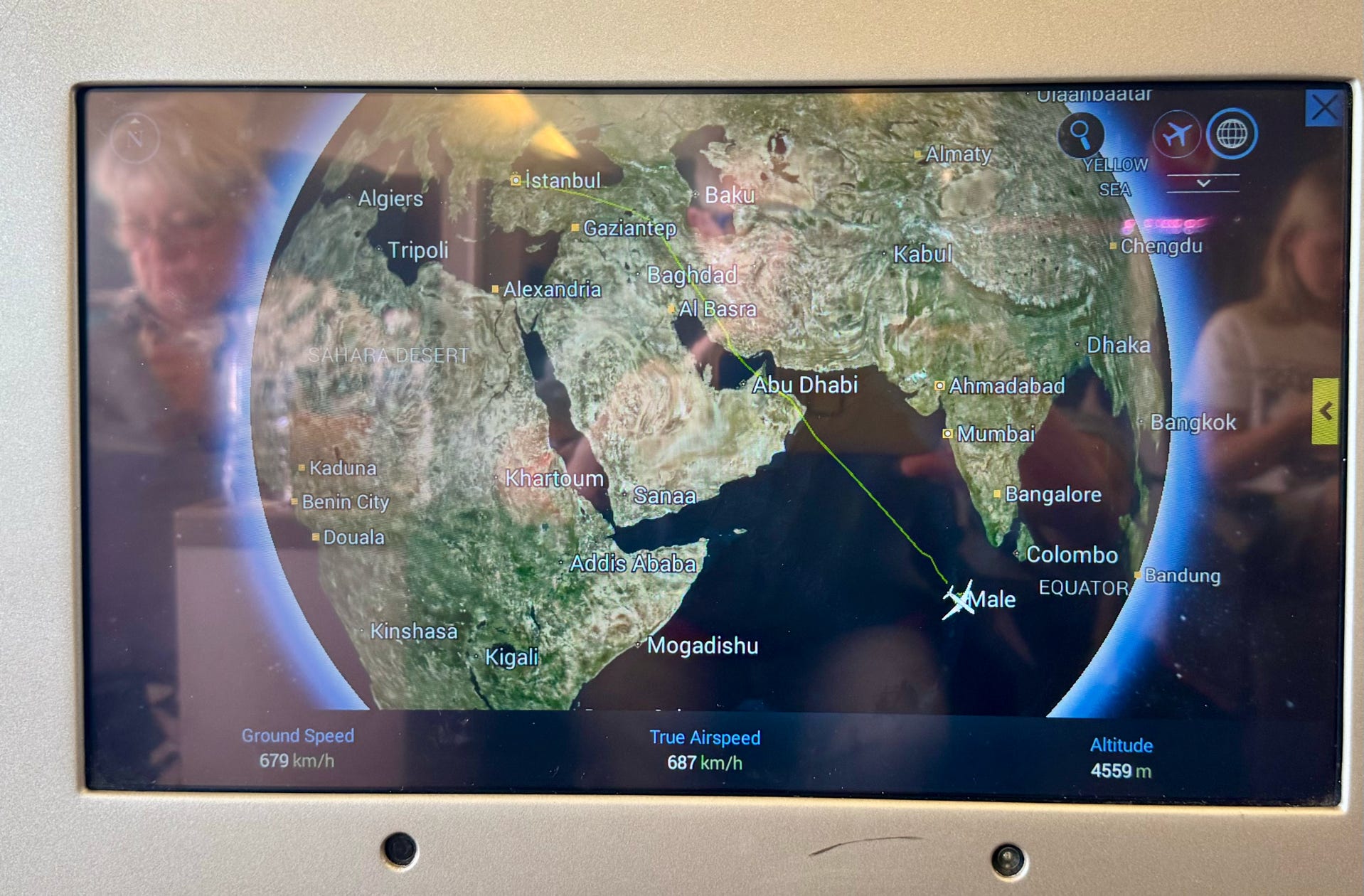 Oben: nicht mehr weit bis Male - Flugroute von Istanbul.