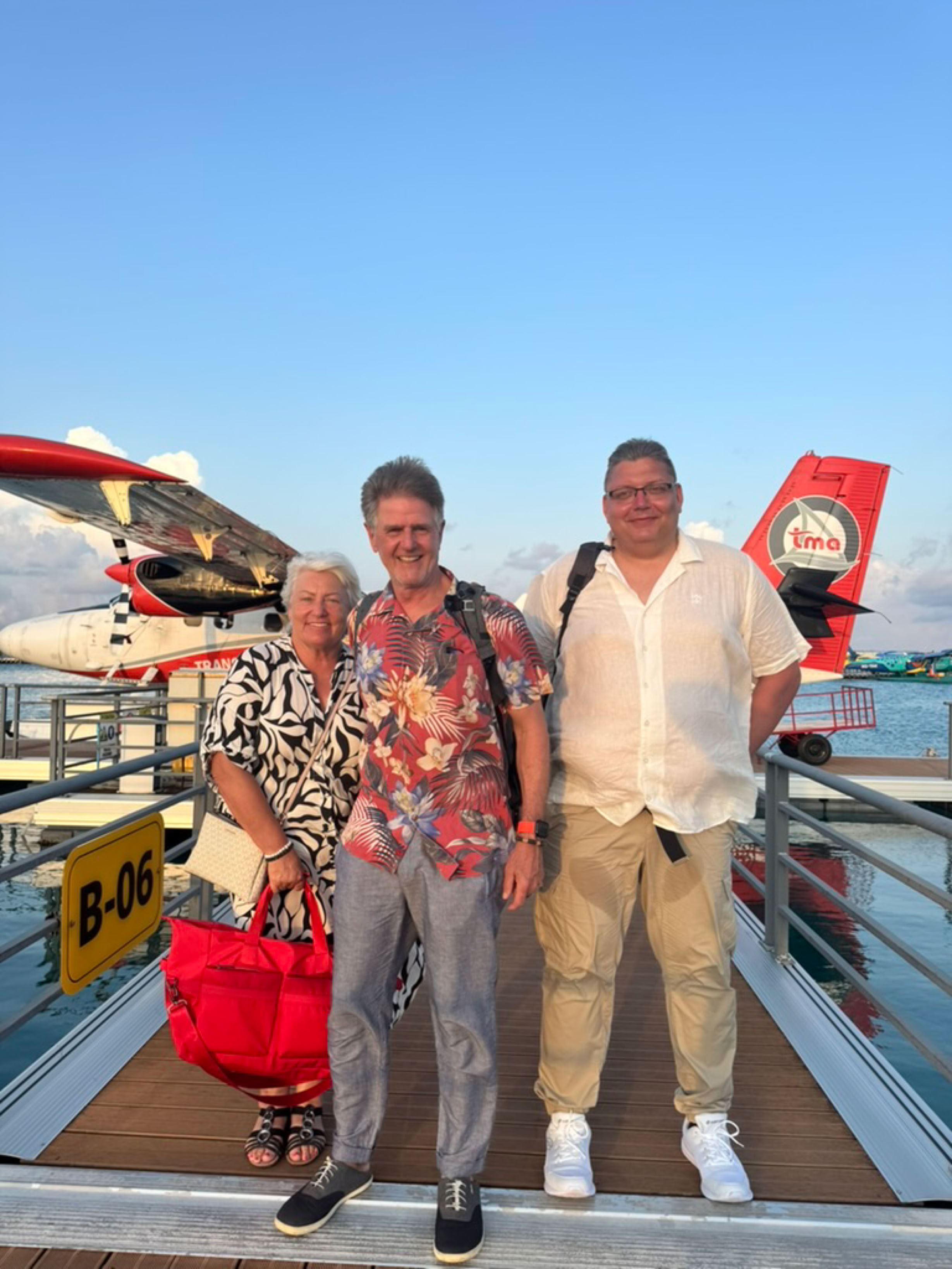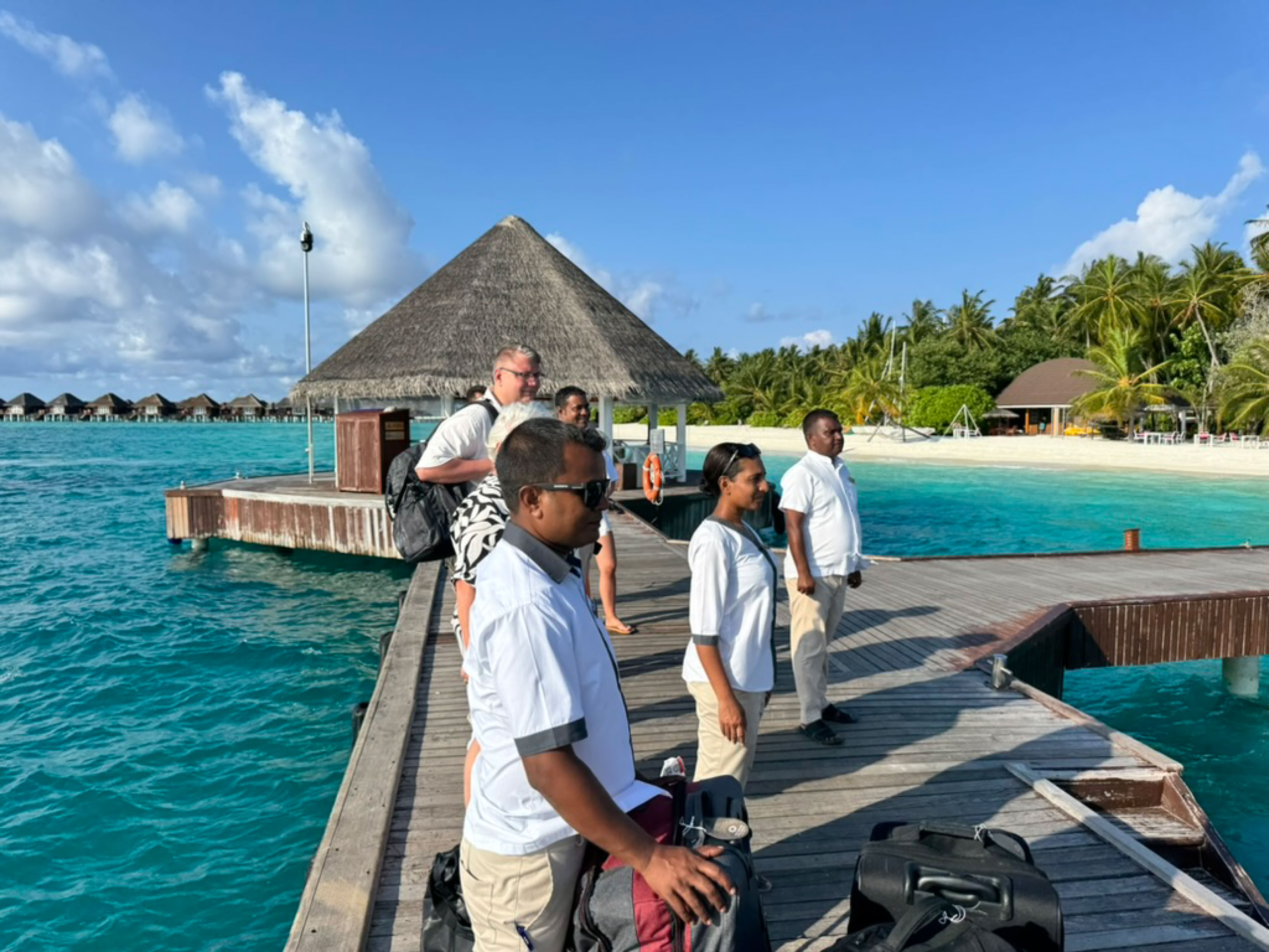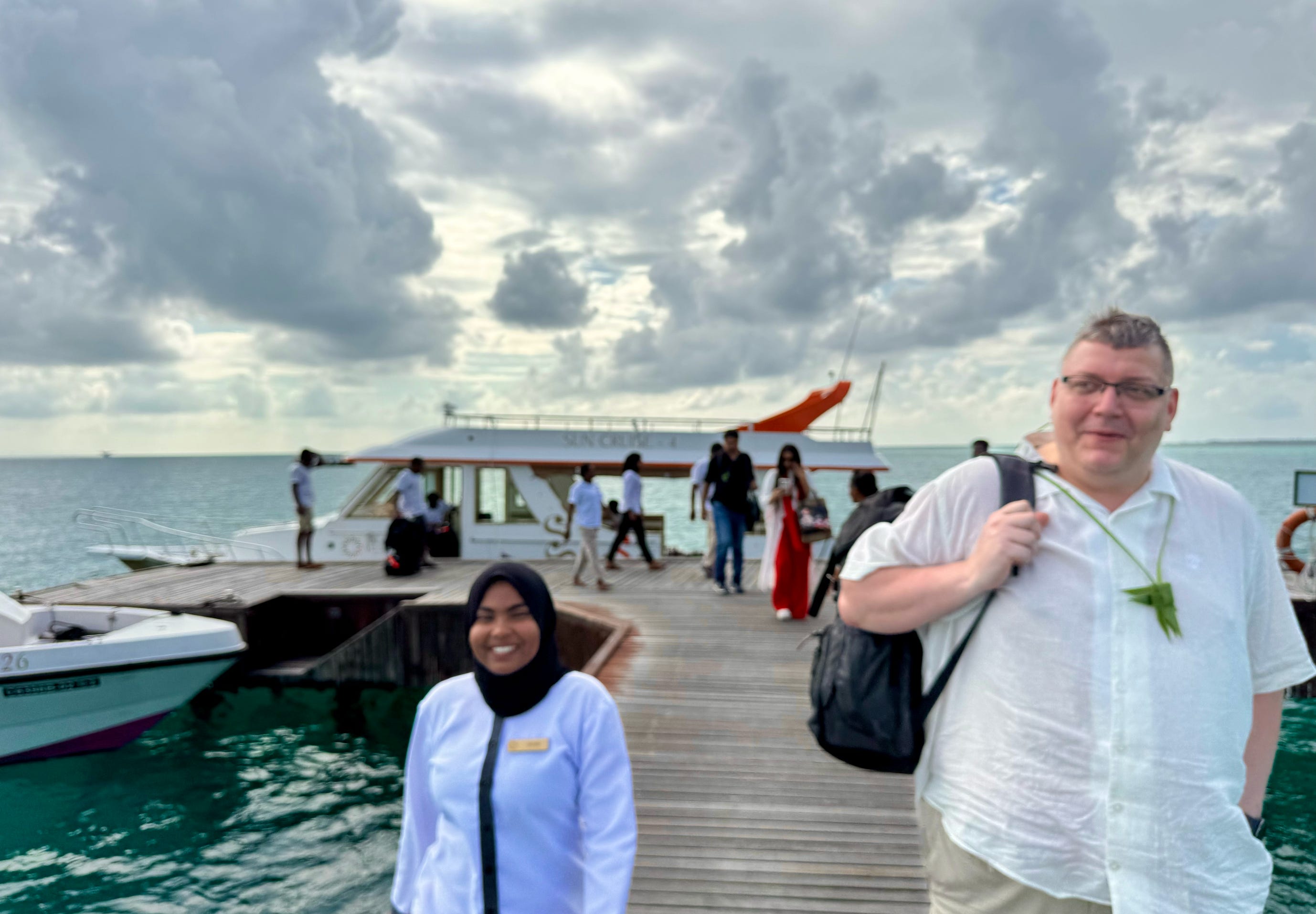 Ein freundlicher Mitarbeiter von Sun Siyam Resorts erwartet uns bereits.