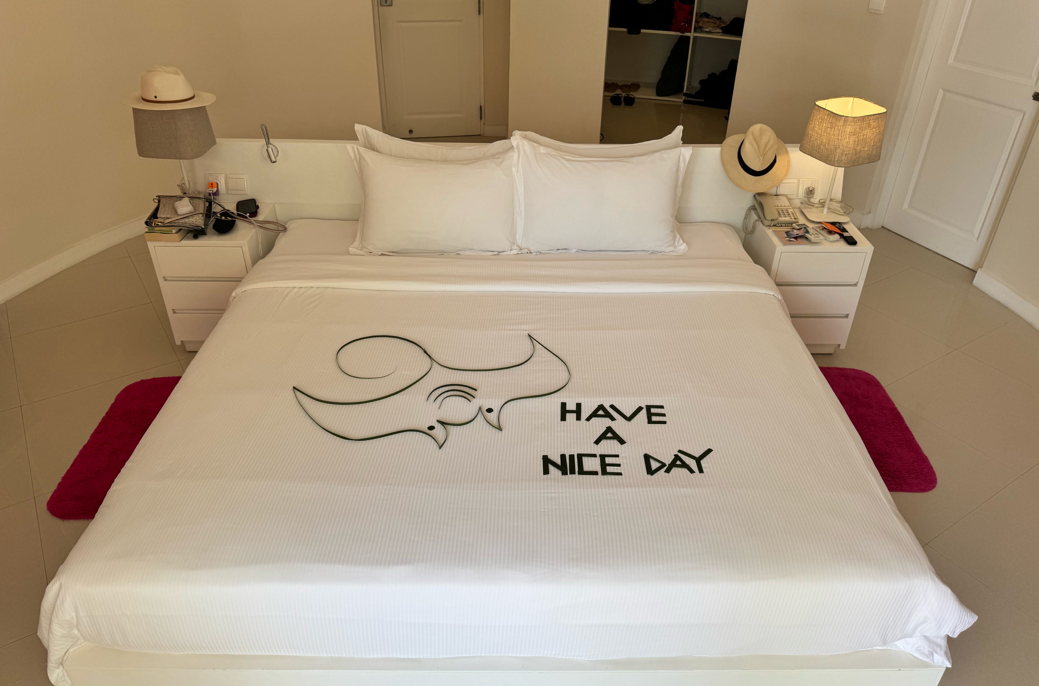Zwischenzeitlich hat unser Reinigungsmann einen netten Manta auf unser Bett gezaubert.
