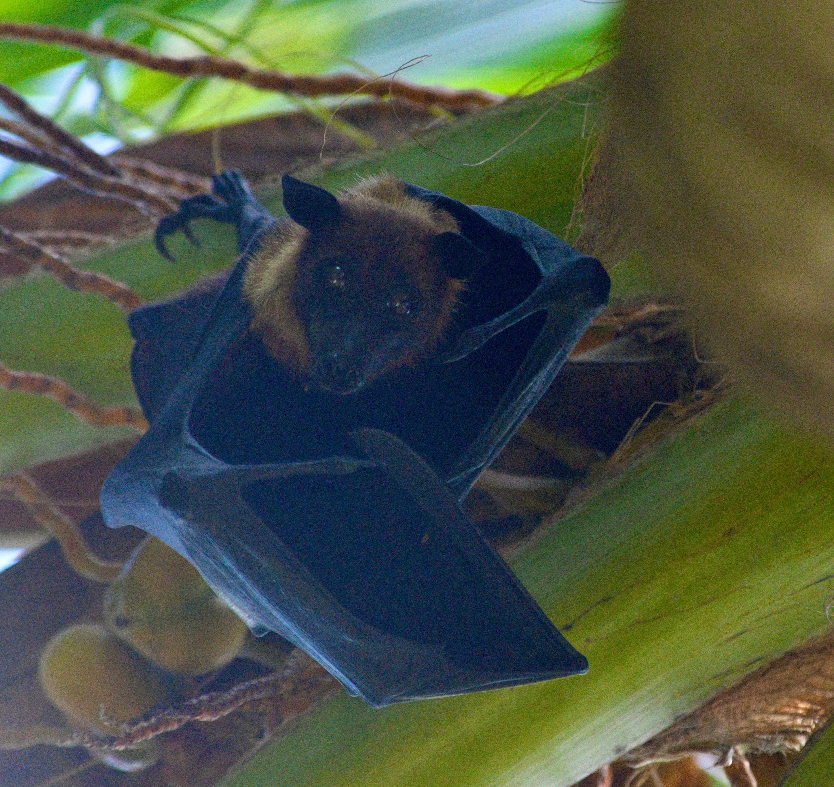 Ein paar Fotos von einem Flughund (im englischen heißt er Flying Fox oder Fruit Bat), der es sich in der “Nachbarpalme” gemütlich gemacht hatte.
