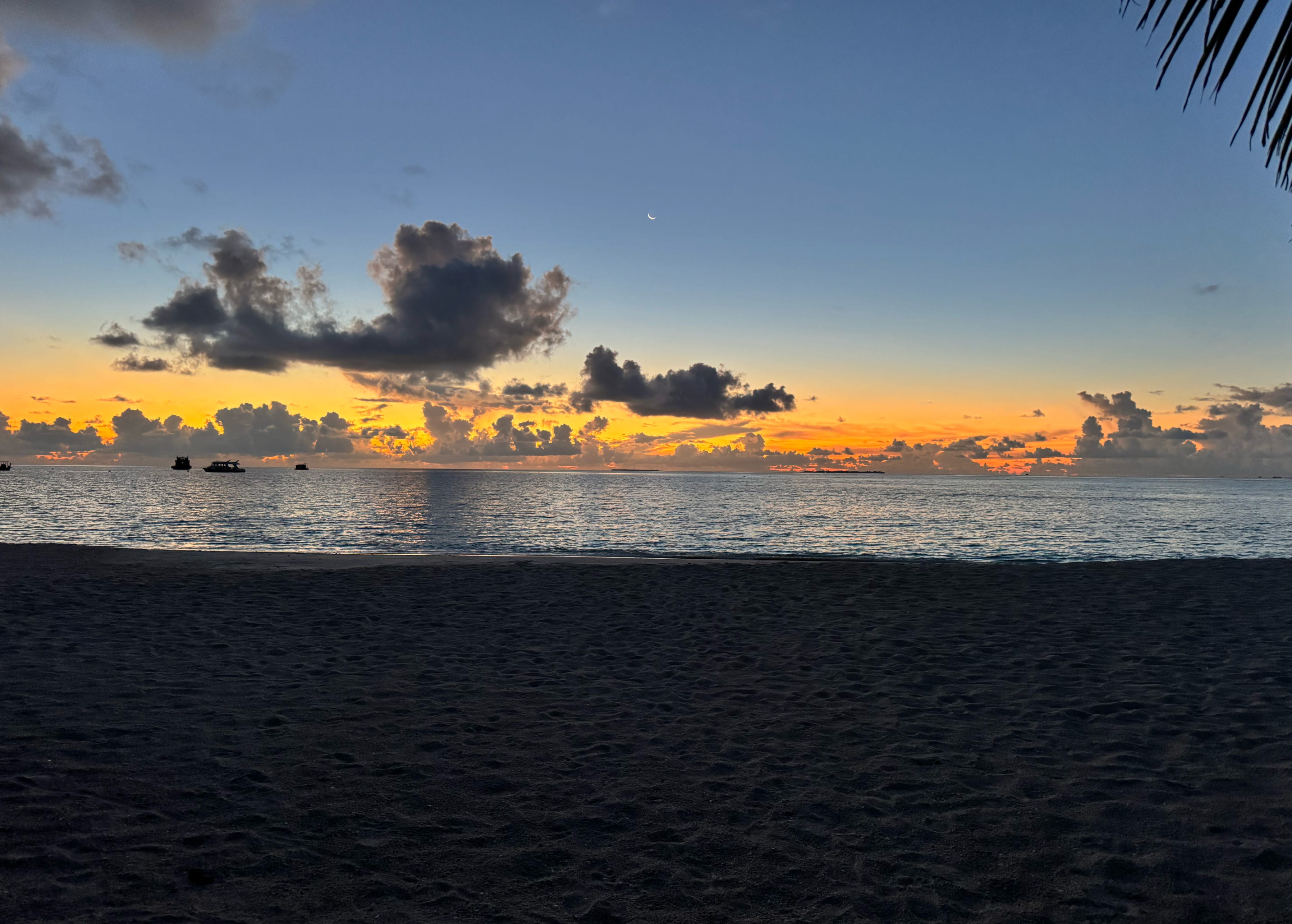Den Sonnenuntergang beobachten wir von unseren Liegen am Strand.