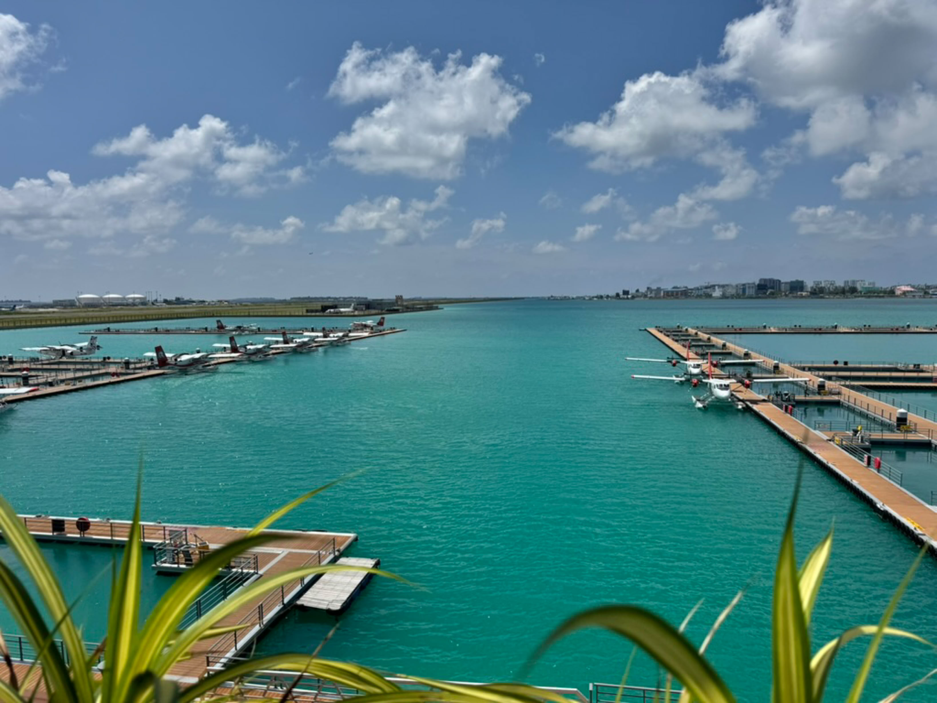 Blick von der Sun Siyam Lounge auf “Abfluggates” der Wasserflugzeuge
